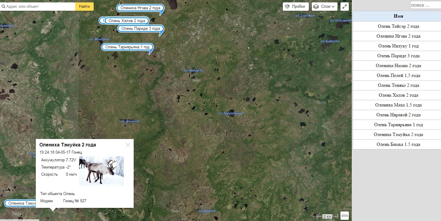 Система спутникового мониторинга установлена на 13 оленях Ненецкой АПК в январе этого года в рамках пилотного проекта, профинансированного нефтяной кампанией «Восток НАО». С помощью терминалов спутниковой связи TracerPro «Гонец» можно в любое время определить местонахождение бригады или стада. Их точное местоположение уже можно узнать с помощью программного обеспечения, которое установлено на компьютеры предприятия. Информация отображается на карте в интернете.